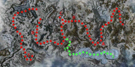 First off, you want to talk to Ascalon Guard Hayden who is holding the Torch. He will pass the torch to you and you'll have to carry it throughout the first part of the mission. You need to light the Storm Beacons until you come to Ascalon Guard Tolis (A on the map). Don't forget to light the one right next to Hayden. You shouldn't have too much trouble against the centaur patrols.