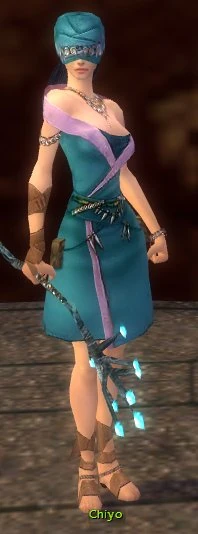 Chiyo is Emi's twin sister. When they were younger, they both studied with Mhenlo under Master Togo and have since grown up when Mhenlo returned to Cantha. The sisters are very grateful to Mhenlo. Chiyo has apparently grown out of her affection for Mhenlo; her sister is still enamored.