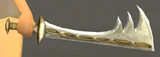 A short blade with three spikes towards the end, pointing out from the blunt side, and an elongated-oval pattern running down the length of the blade.