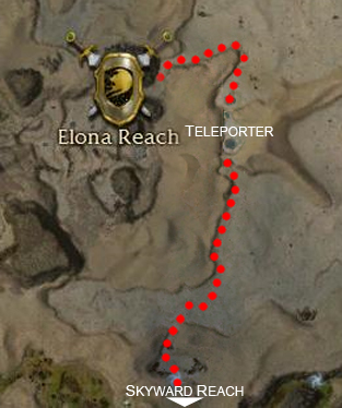 Either travel west from Destiny's Gorge into Skyward Reach before continuing north into Diviner's Ascent or travel east from Seeker's Passage across the Salt Flats. Elona Reach is near the center of Diviner's Ascent.