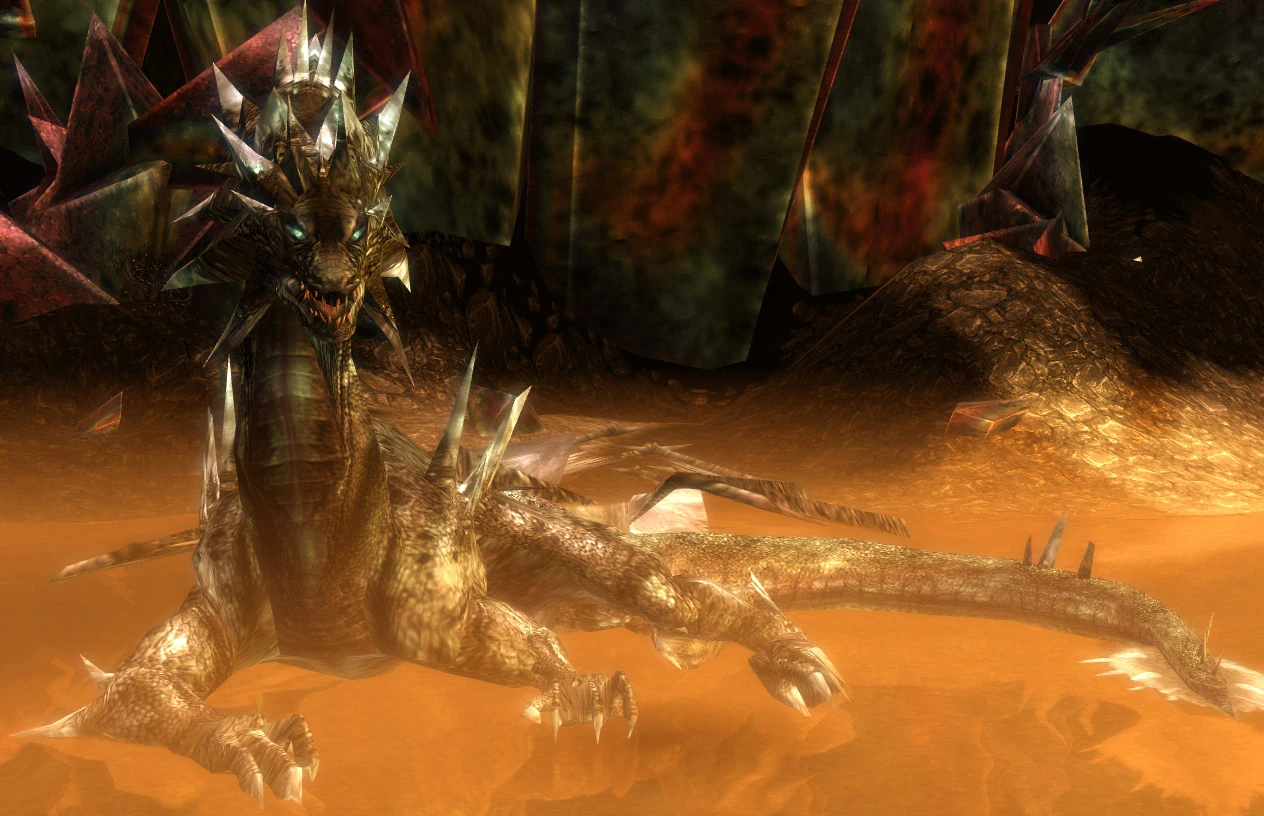 Glint is a Dragon of ancient age - nearly 3000 years old. She is a prophet and an oracle, making prophecies about the future of Tyria. In the mission Dragon's Lair, the players seek an audience at Glint and she recognizes them as the Chosen, foreseen to save Tyria. Her lair is said to be inside a single grain of sand in the vast Crystal Desert.