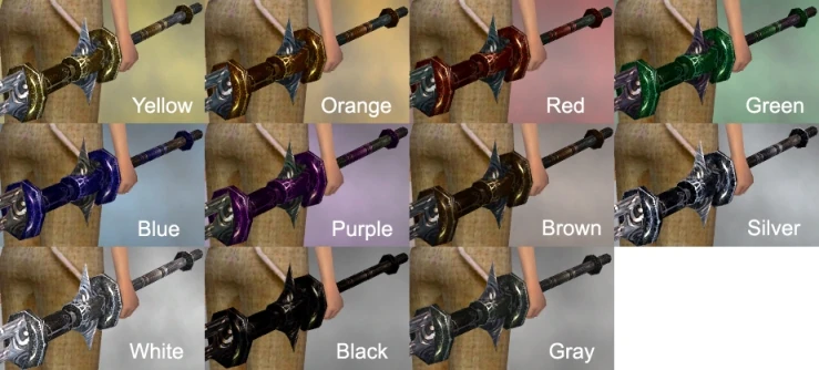 Dye affects the whole spear including the head and any decorations on the handle. The default color is yellow.