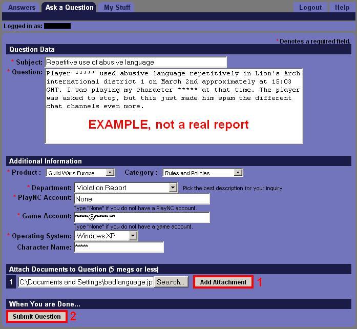 As Guild Wars is an online game, you might come across a few very varied and sometimes disturbing people. Some people discriminate, which is against the Guild Wars End User License Agreement (EULA), or otherwise disturb other players. While playing, you might also discover something in the game mechanics or the game world which supposedly wasn't meant to be as it is, a bug. Sometimes you might also encounter technical difficulties with playing the game. All of these can be reported to Arenanet through their support page.