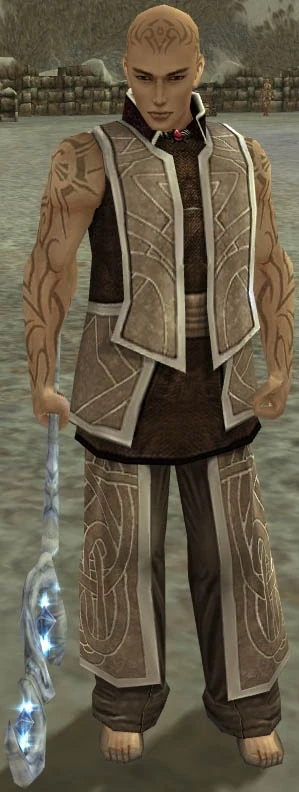Mhenlo was born in Serenity Temple to a priestess of Dwayna and a priest of Balthazar. Although he was tutored in the magic of both these gods, he does not use any Smiting Prayers in the game. He is a member of the Heroes of Ascalon.