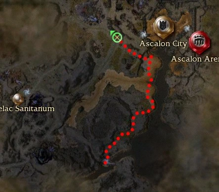 Alternate route: As shown on the map, rather than going from the sanitarium, leave from Ascalon City and travel underneath the bridge (turn left), following the dried stream, a slightly longer walk, but there are far fewer monsters and so is less dangerous.