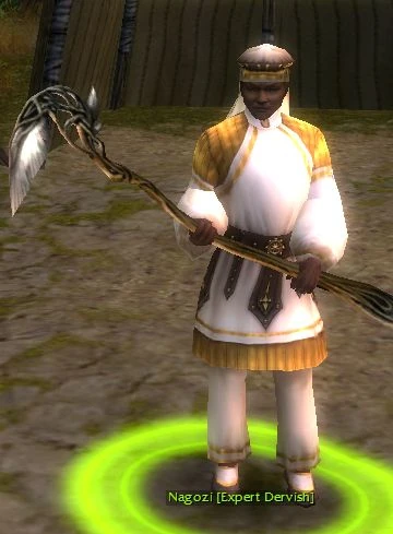 Nagozi is a Dervish expert for the Sunspears. He explains about the area of effect for spells together with Wanjala (a Monk expert) and Nalah (an Elementalist expert). He also teaches about enchantments.
