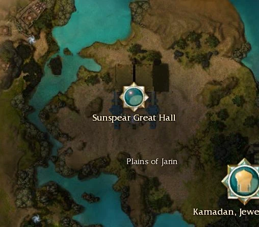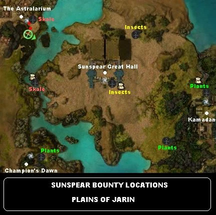 The Sunspear bounties available in Plains of Jarin and which shrines they are offered at are listed in the following table; refer to the map at right for the exact locations of the shrines. In Normal Mode, they are only available to characters whose level and Sunspear rank are equal to or less than those noted in the table. All bounties are available to all characters in Hard Mode.