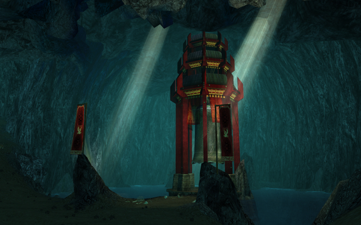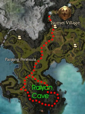 Raiyan Cave is a natural grotto with entrances in two locations in the central southern area of Panjiang Peninsula. The cave is populated by a large cohort of Naga, some of which will pop-up in the middle of the cave by the water. Several Necromancer quests involve killing the Naga in the cave. During the Dragon Festivals, the quest Darkness at Kaitan involves shutting a Chaos Rift that forms in the cave.
