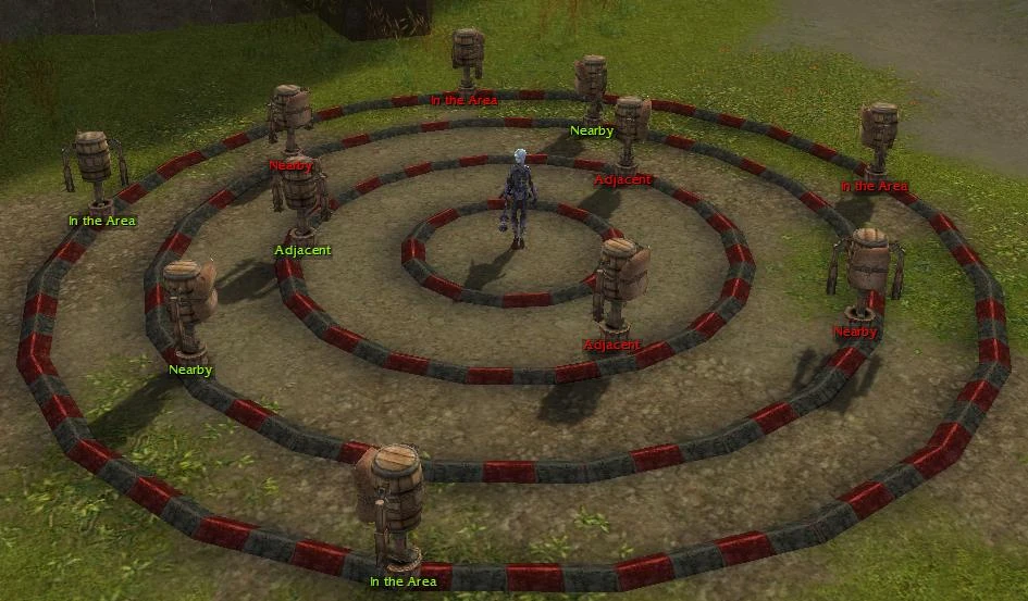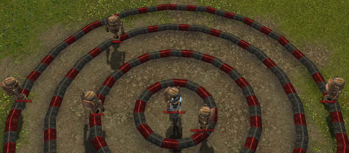 - For a visual reference in the heat of battle, it is useful to note that the shadow cast by your character is roughly the same size as the innermost testing circle (i.e. adjacent to self).