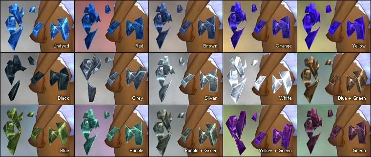 Only Storm Artifacts obtained from collectors or weaponsmiths may be dyed. Dye affects the whole item; however, it will not dye to the color applied, but rather to the opposite color. The exceptions to this are black, white, silver, and grey which dye true to the applied color. It does not have a default dye color.