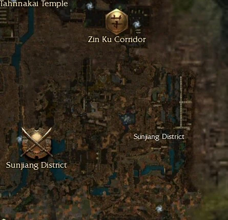 Initially, only the eastern part of the district, a fairly dull road along a river, is explorable. Finishing Arborstone (mission) unlocks the gates to the western part of the district. These tight, low-lying streets, of which a large part is flooded with water, were used as a base by Shiro in Sunjiang District (mission).