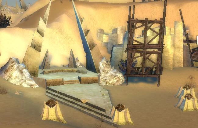 Teleporters in the Crystal Desert are large, whitish-brown scructures, with four switches surrounding the base. If you activate a teleporter (instructions below) and step on its circular platform, it will teleport you to its matching teleporter somewhere else in the desert (usually nearby and possible to see on the map).