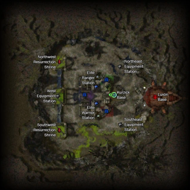 Players may enter the opposing teams base to cap the internal shrines, however the eastern part is guarded by a invulnerable, stationary NPC named Base Defender.