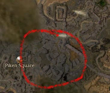 - To reach the W-area, (see image) follow the mission path after the cutscene until you see a group of Charr running up towards you from the right. Make a right turn onto this path. It'll lead you through an alternate path to reach the captain and uncover a large southwestern area of the map at the same time.
