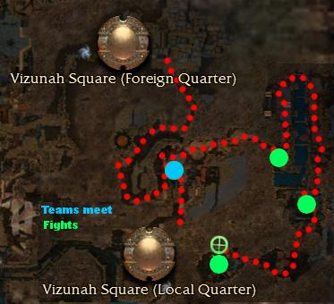This is the game's first two party mission, with teams coming from Vizunah Square (Local Quarter) and Vizunah Square (Foreign Quarter). The game attempts to join parties together every 60 seconds (the mission count-down shows the remaining time until the next grouping). If there is no team from the other location, your party will be paired with a team of 8 henchmen. Two teams (one from each quarter) can attempt to start the mission together by coordinating when they click, Begin Mission, but this will not work if anyone has already queued up.
